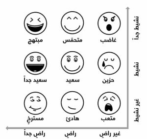 وينتج عن ذلك مجال ثنائي الأبعاد يمكن أن يكون المستخدمون فيه بواحدة من تسع حالات مختلفة. فعلى سبيل المثال، إذا كان الشخص نشيطاً جداً وغير راضٍ فهو في حالة غضب، أما إذا كان راضياً جداً وغير نشيط فهو في حالة استرخاء.