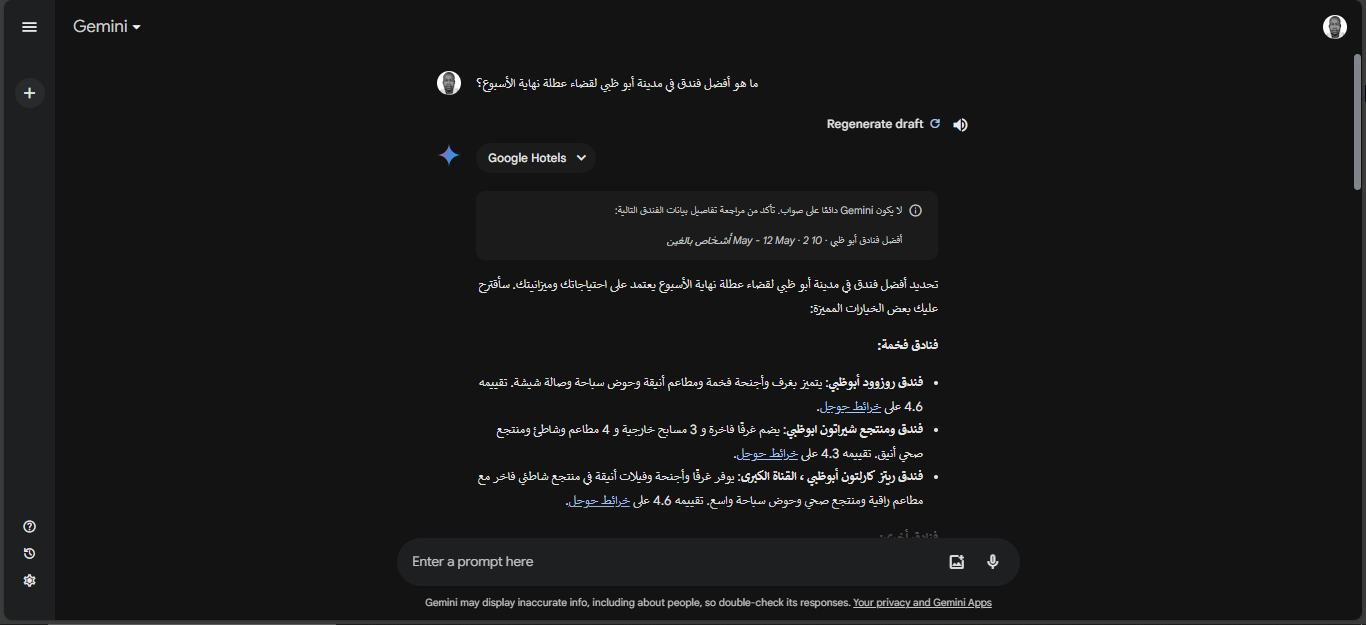يمكنك أيضاً أن تطلب من بوت الدردشة جيميناي تعليقات الزوار حول فنادق معينة، على سبيل المثال إذا سألت: "اعرض لي تعليقات عن فندق ريتز كارلتون في مدينة أبوظبي" سيعرض بعض تعليقات الذين كانوا في هذا الفندق، كما يمكنك أن تطلب منه تسليط الضوء على المراجعات السلبية على وجه التحديد حتى تتمكن من اتخاذ قرار مستنير.