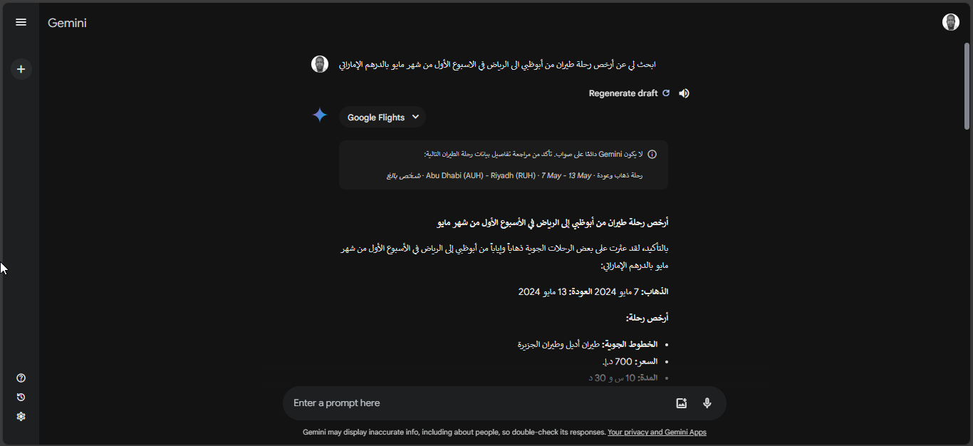 تُتيح إضافة جوجل فلايت (Google Flights) في بوت الدردشة جيميناي الحصول على معلومات رحلات الطيران في الوقت الفعلي، حيث يمكنك طرح أسئلة مخصصة حول الرحلات الجوية، مثل "ابحث لي عن أرخص رحلة طيران من أبوظبي إلى الرياض بالدرهم الإماراتي"، وستكون النتيجة: