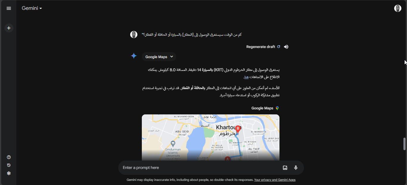 بالإضافة إلى ذلك، يمكنك استخدام بوت الدردشة جيميناي للمساعدة على مقارنة مدة التنقل عبر وسائل النقل المختلفة. على سبيل المثال، إذا كنت تتساءل: "كم من الوقت سيستغرق الوصول إلى [أدخل اسم الوجهة] بالسيارة أو الحافلة أو القطار؟" سيؤدي ذلك إلى ظهور نتيجة تبين مدة التنقل لكل وسيلة، مع وضع روابط للتحقق من الطرق عبر خدمة خرائط جوجل.