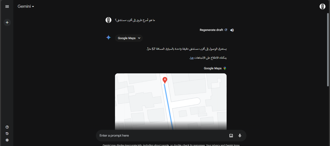 إذا أردت الوصول إلى وجهة معينة لا تعرف كيفية الوصول إليها بالضبط، يمكنك سؤال بوت الدردشة جيميناي لمساعدتك في الحصول على الوجهة بالتفصيل. على سبيل المثال، إذا سألت "ما هو أسرع طريق إلى أقرب مستشفى؟" سيظهر طريق المستشفى الأقرب لمكانك الحالي بالإضافة إلى خيارات أخرى للمستشفيات القريبة إذا وُجِدت، وبالضغط على الرابط سيُعاد توجيهك إلى خدمة خرائط جوجل حيث يمكنك البدء في رحلتك.