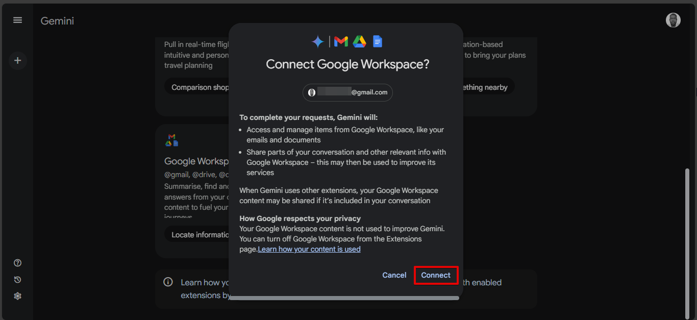 عند تبديل إضافة مساحة عمل جوجل (Google Workspace) ستظهر لك نافذة منبثقة تطلب منك الموافقة على الوصول إلى حسابك الخاص بالعمل أو حسابك الشخصي، حيث سيسمح ذلك لبوت الدردشة جيميناي بمساعدتك على التعامل مع تطبيقات جيميل وجوجل درايف ومستندات جوجل بسهولة.