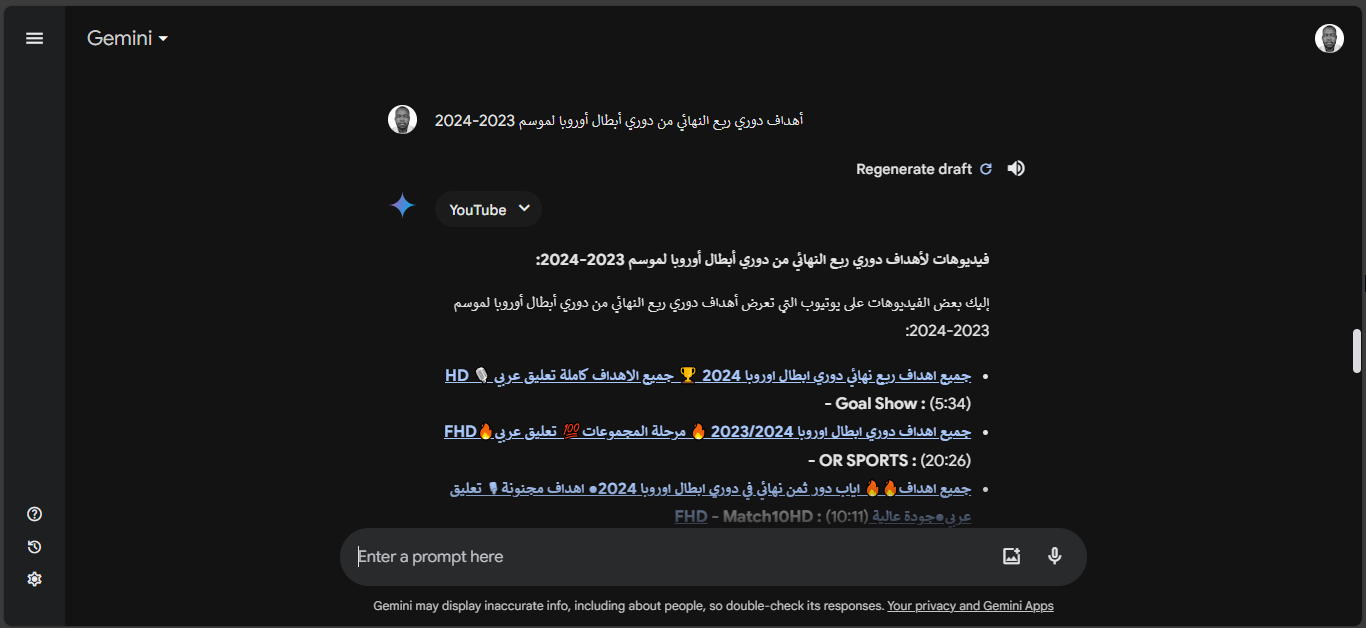 على سبيل المثال يمكنك سؤاله: "أهداف دوري ربع النهائي من دوري أبطال أوروبا موسم 2023-2024"، وسيستخدم محرك بحث يوتيوب للعثور على مقاطع الفيديو ذات الصلة.