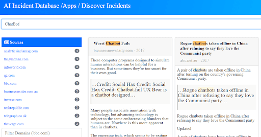 ويمكن لأي شخص استعراض هذه الحوادث والبحث فيها تبعاً للمصدر أو رقم الحادث أو كلمة مفتاحية. وعلى سبيل المثال عند البحث عن مصطلح بوت الدردشة "ChatBot"، تحصل على 69 تقرير حول حالات فشل لهذه الأنظمة.
