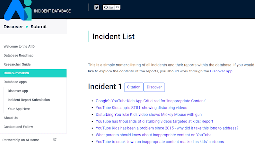 تضم قاعدة بيانات حوادث الذكاء الاصطناعي أكثر من 1,000 حالة فشل لأنظمة الذكاء الاصطناعي في العالم الحقيقي بناء على ما أوردته وسائل الإعلام والمصادر الأخرى المفتوحة. وتغطي هذه الحوادث نطاقاً واسعاً من المشاكل مثل أنظمة توصية الفيديوهات للأطفال على يوتيوب التي تقترح محتوى غير لائق، وحوادث السيارات ذاتية القيادة، والأخطاء القاتلة لروبوتات العمليات الجراحية، وعنصرية بوتات الدردشة وخوارزميات تقييم المخاطر المستخدمة في الأنظمة القضائية، والتحيز والتمييز على أساس الجنس أو العرق أو الإعاقة في خوارزميات التوظيف القائمة على الذكاء الاصطناعي وغيرها.