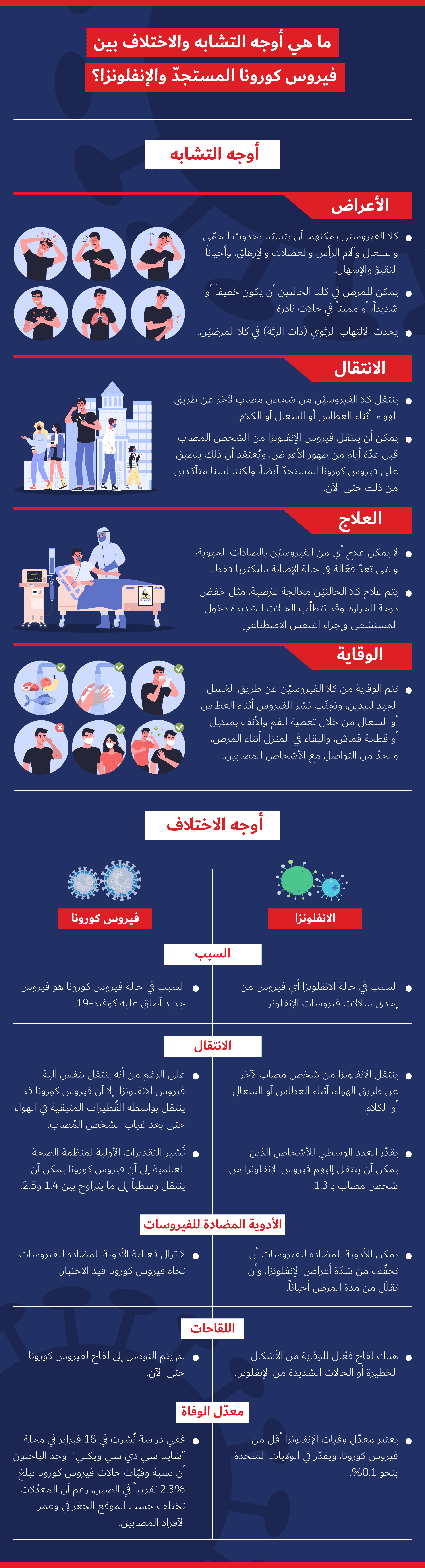 تصدّر فيروس كورونا المستجدّ عناوين الأخبار خلال الشهرين الماضيين، ولكن يُصادف أيضاً في هذه الفترة من كل عام موسم الإنفلونزا. حتى 2 مارس، أدى فيروس كورونا إلى نحو 89 ألف إصابة حول العالم، وتسبّب بمقتل 3 آلاف شخص تقريباً. ولكنّ هذه الأرقام لا تُقارن مع ما يسبّبه فيروس الإنفلونزا. ففي الولايات المتحدة وحدها، أدى فيروس الإنفلونزا هذا الموسم إلى إصابة نحو 32 مليون شخص ووفاة 18 ألف شخص تقريباً، وذلك وفقاً للمراكز الأميركية للسيطرة على الأمراض.