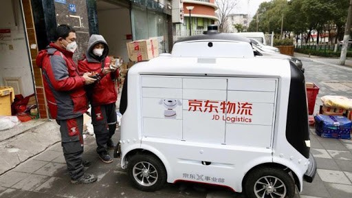 تُظهر صورٌ أخرى استخدام الروبوتات بكفاءةٍ عالية ليس فقط في مجال التخديم ضمن البيئات المغلقة، وإنما أيضاً في مجال التخديم على نطاقٍ واسع، حيث بدأت شركة JD الشهيرة في الصين بمجال التسوّق الإلكترونيّ بالاعتماد على روبوتاتٍ متنقلة ذاتية الحركة يمكن لها أن تقوم بإيصال المواد المختلفة التي يطلبها المستخدمون. مثلت هذه الآلية طريقةً ممتازة لكثير من سكان مدينة ووهان غير القادرين على التنقل بحرية، والذين سيحتاجون بكل تأكيد لمستلزمات الحياة المختلفة، دون تعريض أنفسهم أو غيرهم لخطر الإصابة بالفيروس وبما يُساهم أيضاً بالجهود الرامية لعزله واحتوائه.