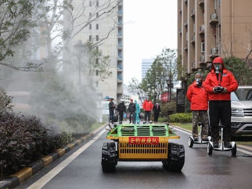 إحدى أبرز النواحي التي برزت قدرة الروبوتات فيها هي إجراء عملية التعقيم والتطهير، وذلك بدءاً من مدينة ووهان التي لا تزال أكبر بؤر انتشار الفيروس والمكان الذي يُعتقد على نطاقٍ واسع أن الفيروس قد بدأ منه، وتحديداً ضمن إحدى الأسواق الشعبية المختصة ببيع الأسماك ولحوم الحيوانات المختلفة. فُرض حظر كامل ضمن المدينة ويقبع كل مَن فيها لحجرٍ صحيّ صارم وعملت السلطات الصينية على بناء مستشفى خلال سرعةٍ قياسية لاحتواء كل الحالات، ولكن هذا لا يكفي؛ إذ إن الفيروس أصبح منتشراً في كل مكان وعملية التخلص منه تتطلب تعقيماً شاملاً. وهنا يأتي دور الروبوتات التي يتم استخدامها بكفاءةٍ عالية لرش المواد المعقمة في شوارع المدينة ضمن الجهود الرامية لضمان أعلى تعقيم ممكن. يتم التحكم في هذه الروبوتات عبر متطوعين يتنقلون باستخدام السكوتر الكهربائية. استخدام الروبوتات بهذه الطريقة يتيح عدة أمور بنفس الوقت: توفير تعقيمٍ من الفيروس في المناطق التي قد يكون خطراً على البشر الوصول إليها، وحماية الفرق الطبية من خطر استنشاق المواد السامة المتواجدة ضمن المعقمات التي يتم بثها في الجو وعلى الأسطح المختلفة.