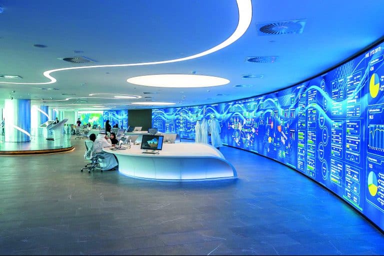 ومن خلال شاشة (LED) هائلة الحجم تمتد على مسافة عرضية قدرها 50 متراً وسماكة 3 ميليمترات وتمتد من الأرضية إلى السقف، تُقدَّم مجموعة متنوعة من المعلومات الآتية من مختلف وحدات الشركة، تتراوح من معلومات الاحتياطي النفطي والآبار البترولية إلى بيانات مواقع منصات الحفر، إلى بيانات البنية التحتية للإنتاج مثل خطوط الأنابيب. وجعل كل هذه البيانات في متناول اليد يتيح لفريق العمل أن يرسم خطط الإنتاج والصيانة بصورة أفضل، وأن يحدِّد السعة الإضافية المتوافرة من النفط بدقة، من أجل الاستجابة لطلبات السوق الإضافية. كما يتيح المركز أيضاً إدارة عمليات (التعطل والتوقف)، وتحديد الوحدات الأخرى التي تستطيع تعويض ذلك النقص.