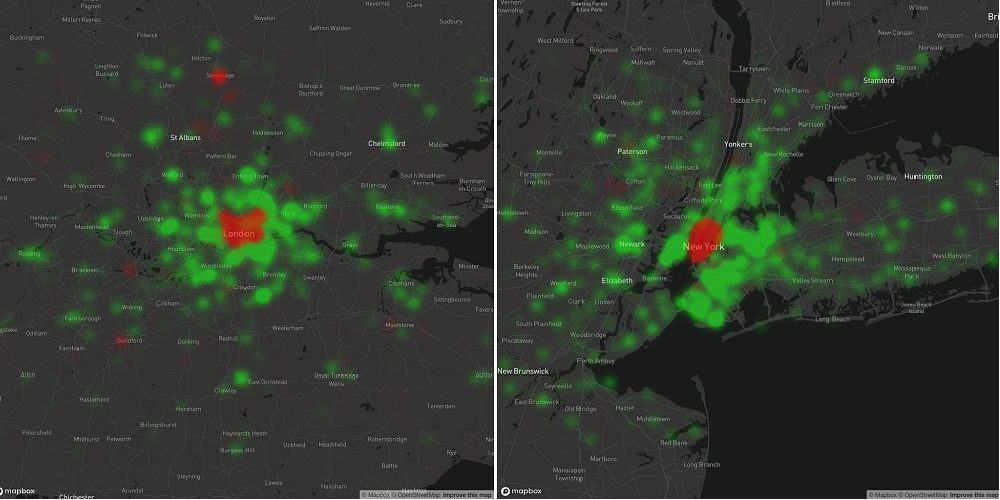 تغير استخدام الإنترنت في لندن (يسار) ونيويورك (يمين) بين الأربعاء 19 فبراير والأربعاء 18 مارس. يظهر اللون الأحمر انخفاضاً في حركة البيانات على الإنترنت، بينما يظهر اللون الأخضر زيادة في هذه الحركة.