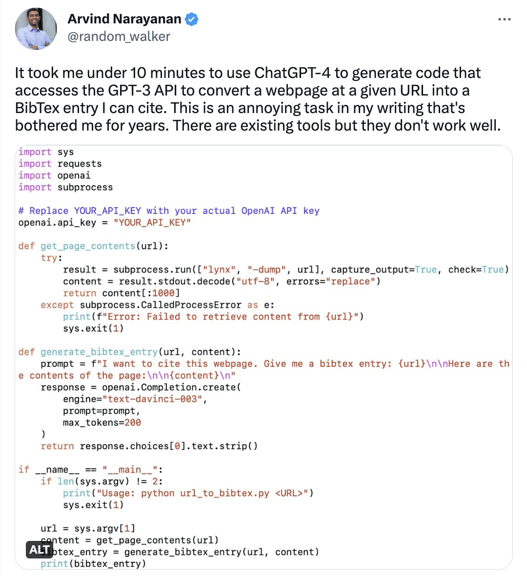 يقول أستاذ علوم الحاسوب في جامعة برينستون، أرفيند نارايانان، إنه لم يحتج إلى أكثر من 10 دقائق كي يقوم بتوليد مجموعة تعليمات برمجية لتحويل عناوين مواقع الإنترنت (URL) إلى اقتباسات باستخدام جي بي تي 4.