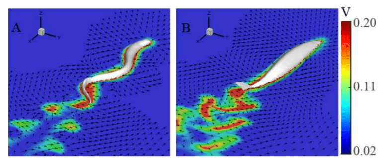 ولمعرفة ذلك، قام تينغيو وزملاؤه بتصميم نموذج حاسوبي ثلاثي الأبعاد لديناميكيات السوائل لنوعين من الأسماك: الأسماك ثعبانية الشكل (مثل الأنقليس) والأسماك الروبوتية (مثل الماكريل). والفرق الرئيسي هو أن الأسماك ثعبانية الشكل تقوم بتمويج أجسادها بالكامل، في حين ينحني النصف الخلفي فقط بشكل كبير من جسم الأسماك الروبوتية.