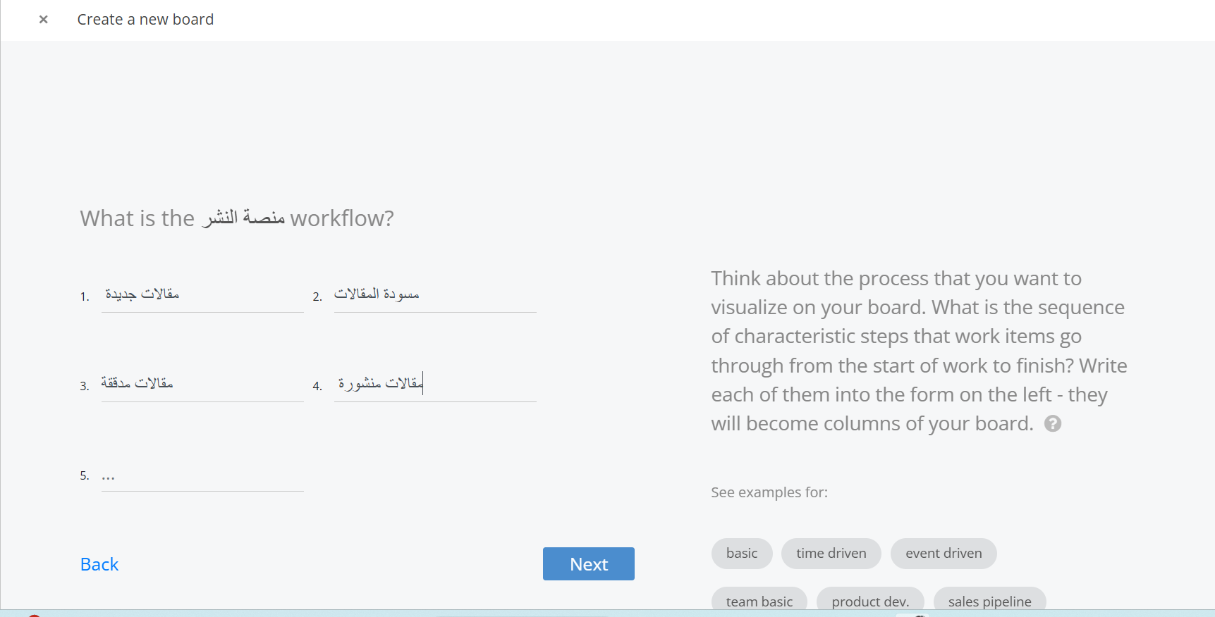 لنفترض أننا نريد تنظيم عملية الكتابة والنشر باستخدام لوحات كانبان، سيكون سير العمل وفق التالي: