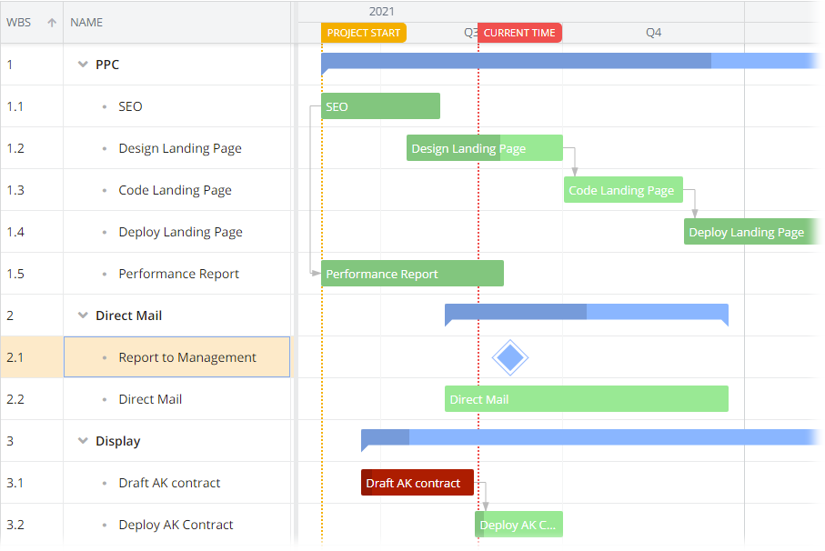 - مراقبة تبعيات المهام: قد تحدث تأخيرات في المشروع. يساعد تمثيل العمل في جدول زمني مدراء المشاريع على أتمتة تبعيات المهام، ما يضمن عدم بدء المرحلة أو المهمة التالية إلا بعد انتهاء المرحلة أو المهمة السابقة.