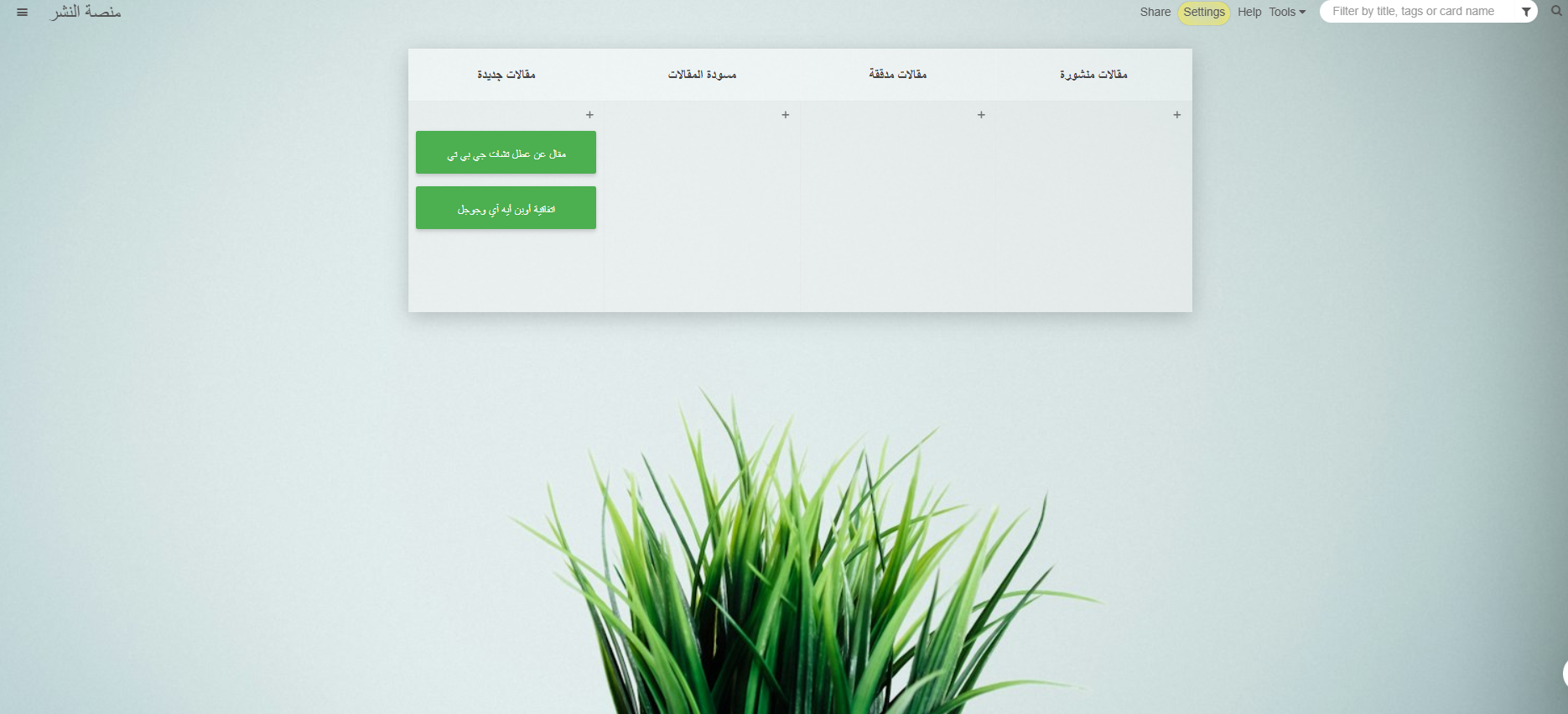 1- على ورقة بيضاء أو لوح نحدد سير العمل وليكن كالتالي: مقالات جديدة، مسودة المقالات، مقالات مدققة، مقالات منشورة.