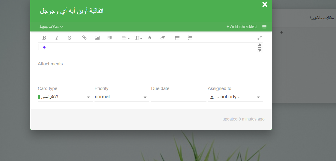 يمكن إرفاق مستندات بالبطاقة ودعوة زميل إلى العمل عليها وتحديد موعد نهائي ووصف كما هو موضح.