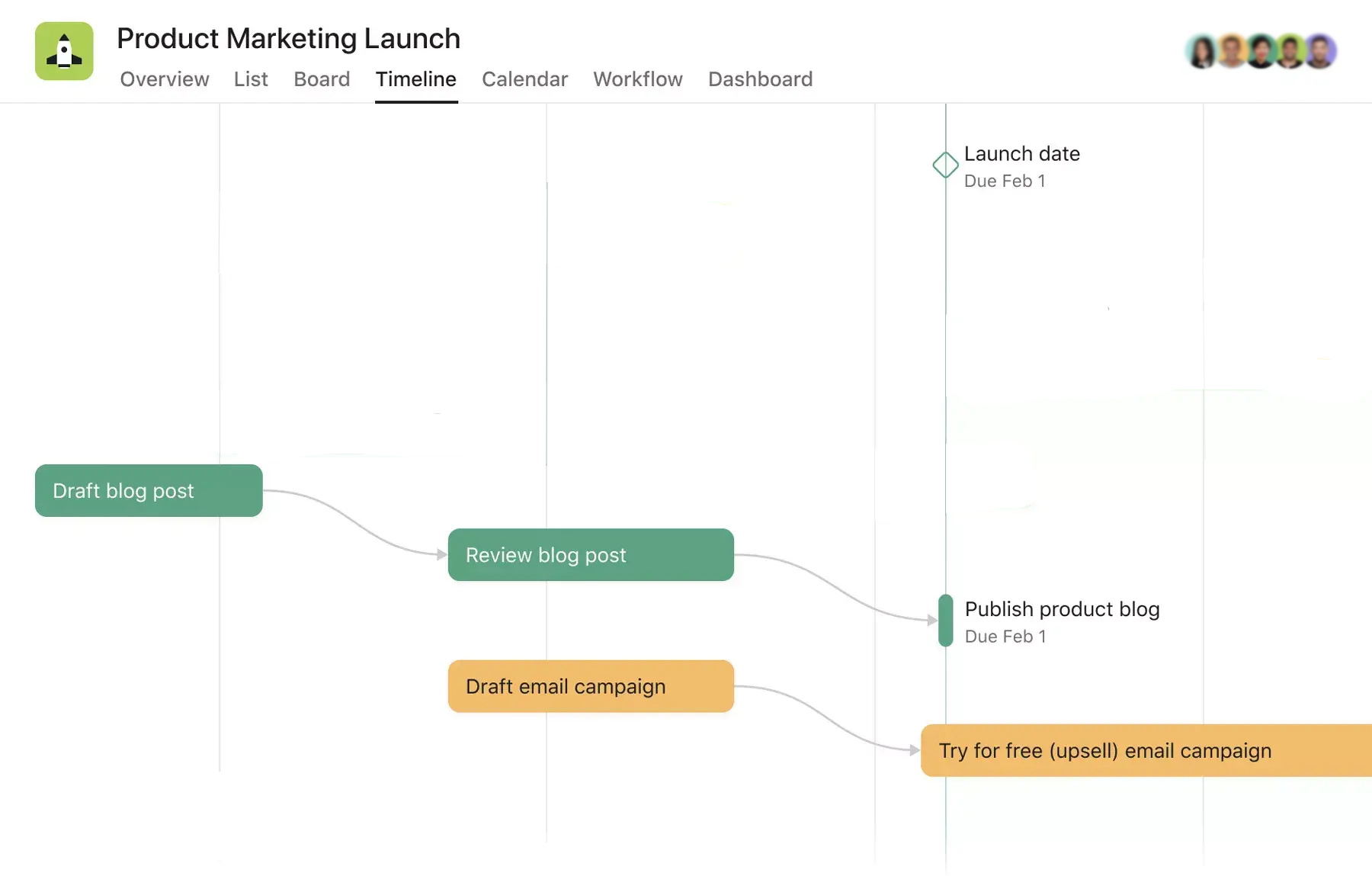 في عمليات إطلاق المنتجات، يمكنك استخدام جدول زمني لرسم الخطة كاملة، من الفكرة إلى الإطلاق وما بعده. فوضع خطة العمل في جدول زمني سيمكن من تحديد المشكلات المتوقعة بالمواعيد بسهولة أكبر قبل البدء ورؤية الترابطات بين الخطوات والحصول على نظرة عامة واضحة على كل ما يحدث قبل الإطلاق وموعده.