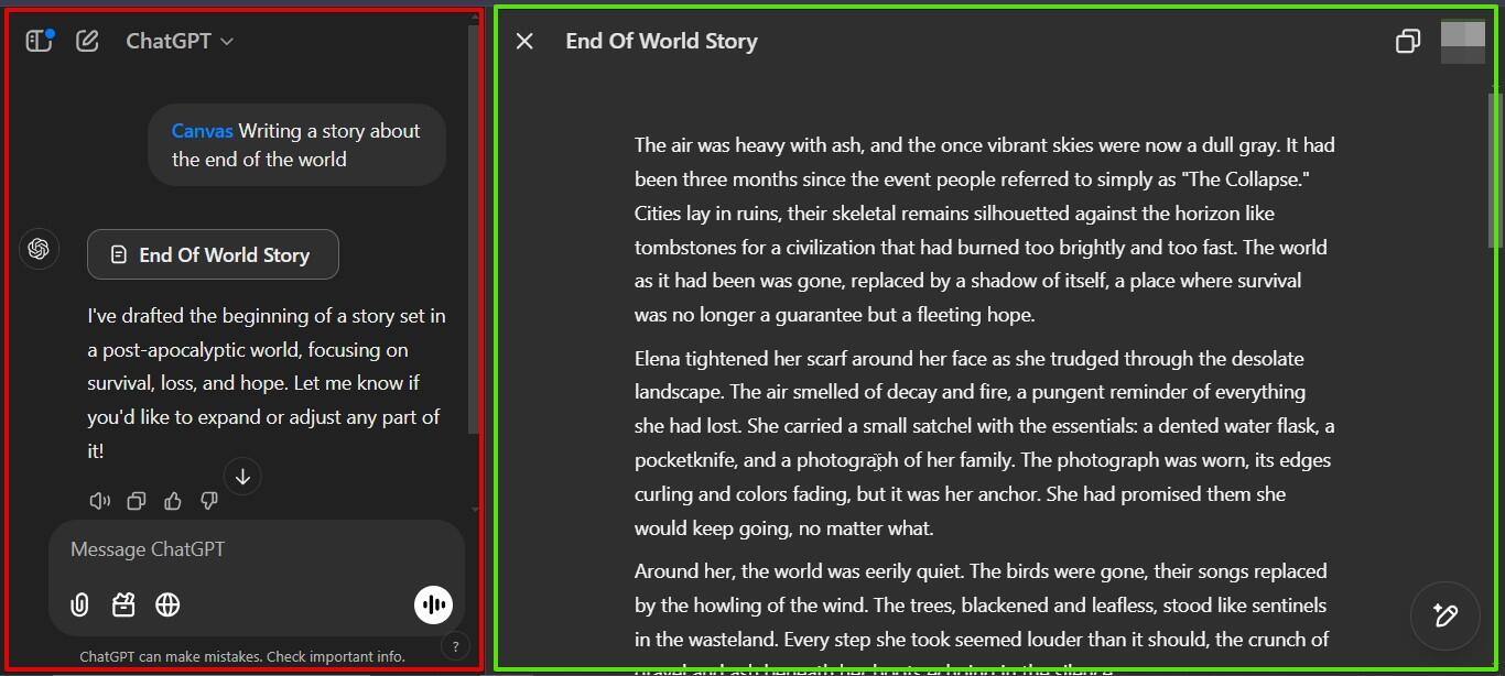 ستُقسَّم الشاشة إلى قسمين، في الجزء الأيسر توجد واجهة الدردشة الرئيسية، بينما الجزء الأيمن هو لوحة تتبع المهام كانفاس التي يوجد فيها ما أنشأه تشات جي بي تي بناءً على مطالبتك.