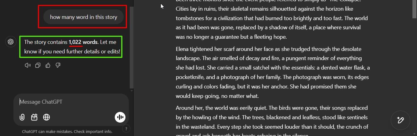 يمكنك الآن البدء بالعمل على النص بمساعدة تشات جي بي تي. على سبيل المثال، يمكنك سؤاله عن عدد كلمات النص الذي أنشأه.