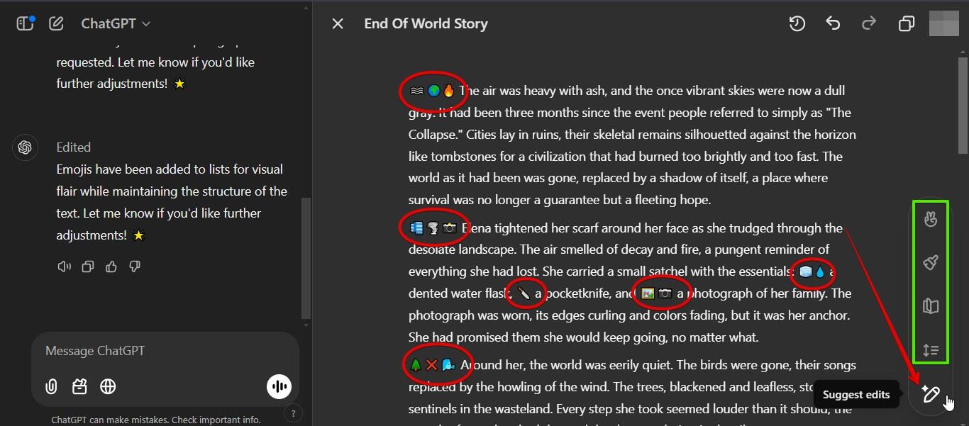 ملاحظة: إذا وجدت أدوات لوحة تتبع المهام معقدة، فيمكنك بدلاً من ذلك اتباع أسلوب المطالبات النصية في شاشة تشات جي بي تي الموجودة في الجانب الأيسر من الشاشة، وستجد أن كل مطالبة أدخلتها سيتم تطبيقها مباشرة في النص الموجود في الجهة اليمنى.