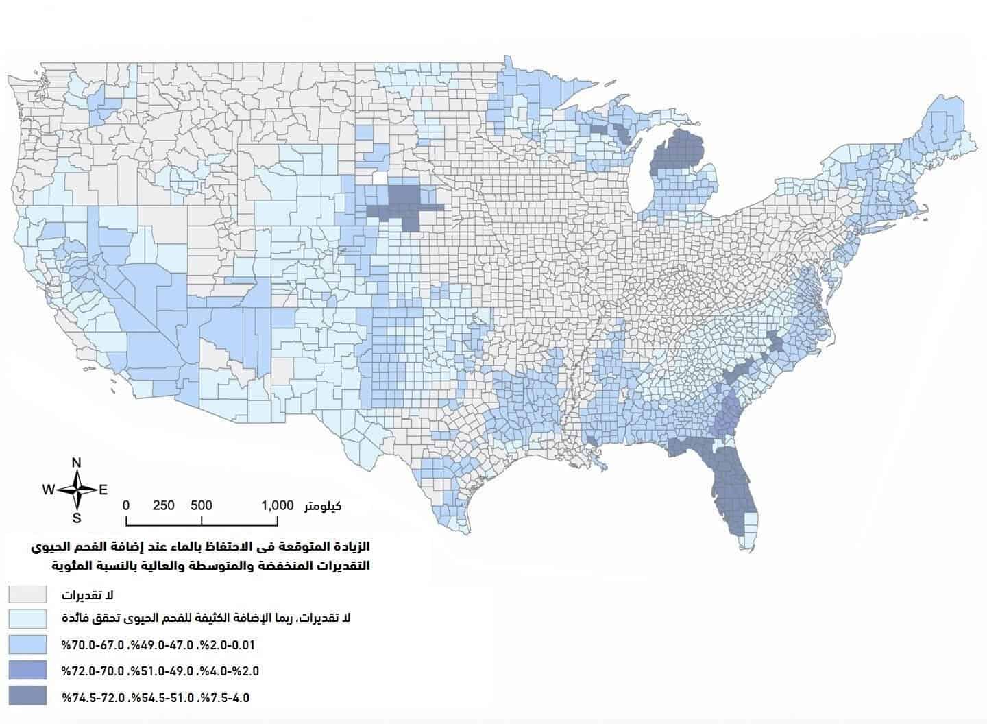 خريطة الولايات المتحدة تظهر الزيادة المتوقعة في قدرة التربة على الاحتفاظ بالماء عند إضافة الفحم الحيوي إليها تبعاً لنوع التربة وخصائص الفحم الحيوي.