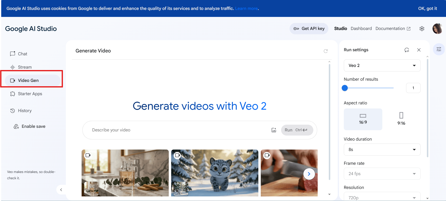 1- اختر Video Gen من القائمة على اليسار، بعد الدخول إلى الواجهة. يُلاحظ أن قيم معدل الإطارات والدقة ثابتة حالياً لا يمكن تغييرها.