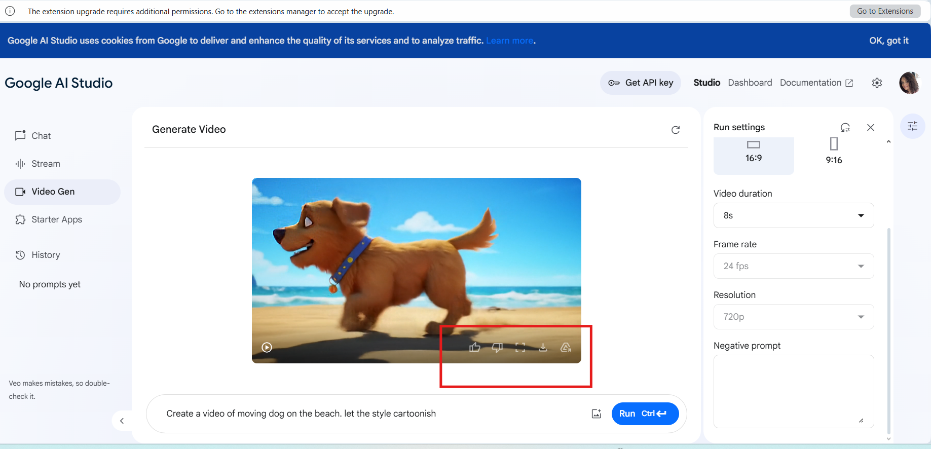 3- أدخلت المطالبة: Create a video of moving dog on the beach. let the style cartoonish