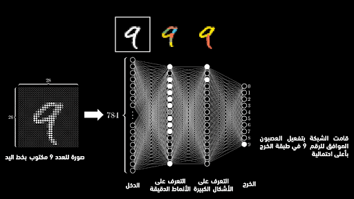 الآن نريد الانتقال إلى الطبقة المخفية الأولى، ومن أجل حساب قيمة تفعيل العصبون الأول فيها، يجب أن نقوم بضرب قيمة تفعيل كل عصبون من طبقة الدخل بوزن وصلته مع العصبون الأول من الطبقة المخفية، ومن ثم يتم جمعها مع بعضها البعض، ثم تُكرَّر هذه العملية من أجل كافة عصبونات الطبقة المخفية الأولى. بعد حساب قيم تفعيل عصبونات الطبقة المخفية الأولى يتم الانتقال للطبقة المخفية الثانية بنفس الطريقة، وهكذا حتى الوصول لطبقة الخرج. يعني الكلام السابق أن تفعيل عصبونات الطبقة الأولى يتم بحسب قيم البيكسلات في الصورة المدخلة، وبما أن قيم البيكسلات ستختلف بحسب الرقم المكتوب، فإن هذا الأمر يعني أن عصبونات الطبقة المخفية الأولى سيتم تفعيلها بآليةٍ تؤدي إلى اكتشاف -والتعرف على- أنماط دقيقة معينة (خطوط ومنحنيات قصيرة)، وهذه الأنماط بدورها ستؤدي إلى تفعيل عصبونات الطبقة المخفية الثانية بقيمٍ تساهم في التعرف على أنماطٍ رئيسية (دوائر، أقواس، خطوط مستقيمة) تم استنتاجها من الأنماط الدقيقة المكتشفة في الطبقة التي سبقتها، وهذا الأمر سيؤدي إلى تفعيل عصبونات الخرج لتعطي القرار النهائي الذي يشير إلى أرجحية أن تكون الأنماط المكتشفة تمثل رقماً دون الآخر.