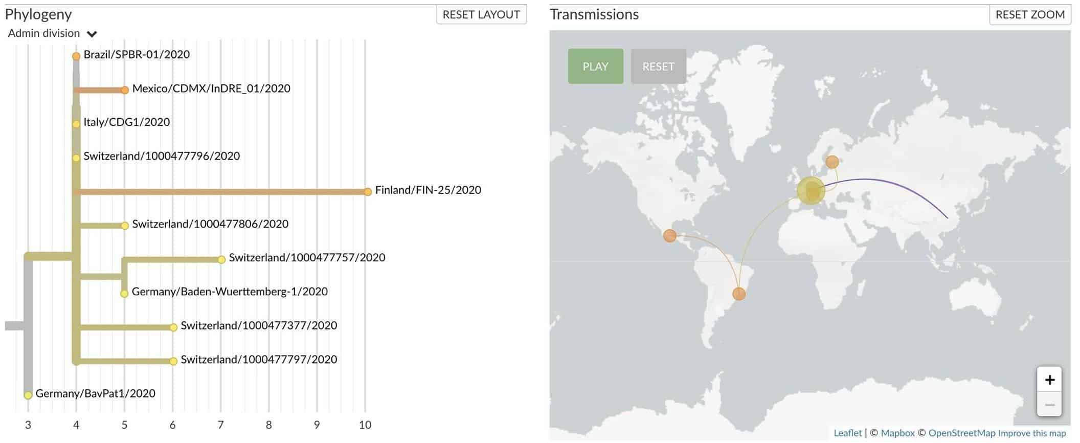 ويقوم العلماء بتمثيل الطفرات الفيروسية التي تتبّعوها على شكل شجرة وراثية حالياً، التي يقولون إنها يمكن أن تساعد في تحديد آلية انتقال العدوى بين البلدان.