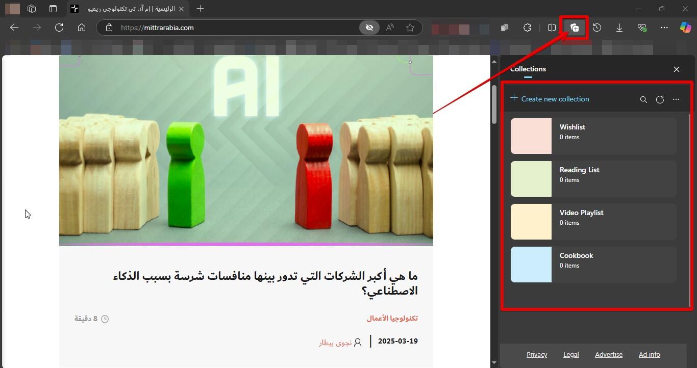 بالنسبة للمستخدمين المُنخرطين في البحث عبر الإنترنت أو جمع المعلومات، تُعدُّ ميزة المجموعات (Collections) أداة فعّالة لتنظيم محتوى الويب واستخدامه بكفاءة، فبدلاً من مجرد وضع إشارة مرجعية على الصفحات، يمكن للمستخدم حفظ أنواع مختلفة من المحتوى عبر الإنترنت وتنظيمها ضمن موضوع أو مشروع واحد، ما يسمح له بجمع المعلومات التي يحتاج إليها بدقة.