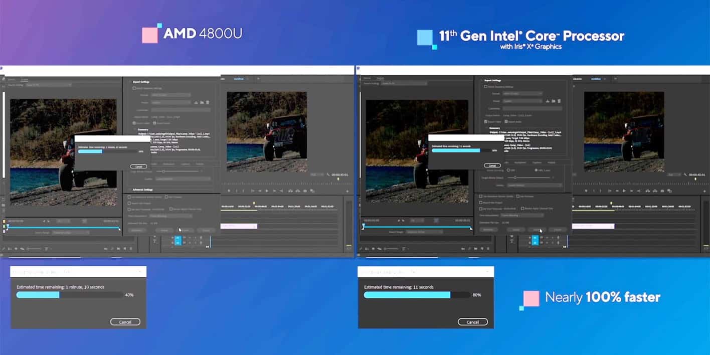 في الليلة التي سبقت موعد الإطلاق الرسمي للجيل الحادي عشر من المعالجات المحمولة “تايجر ليك”، أصدرت الشركة معلومات عن مواصفات الأداء، ولم تقتصر المقارنة على معالج رايزن-7-4800-يو (Ryzen 7 4800U) من صنف المنظومات العاملة على شريحة SoC من شركة إيه إم دي المنافسة، بل وصلت إلى شريحة إنفيديا جي فورس إم إكس 350 الرسومية (Nvidia Geforce MX350)، وهي وحدة معالجة رسومية موجودة في الأجهزة ذات المستوى الأخفض، التي تمثل أرخص الأجهزة التي يمكن ممارسة ألعاب الفيديو عليها.