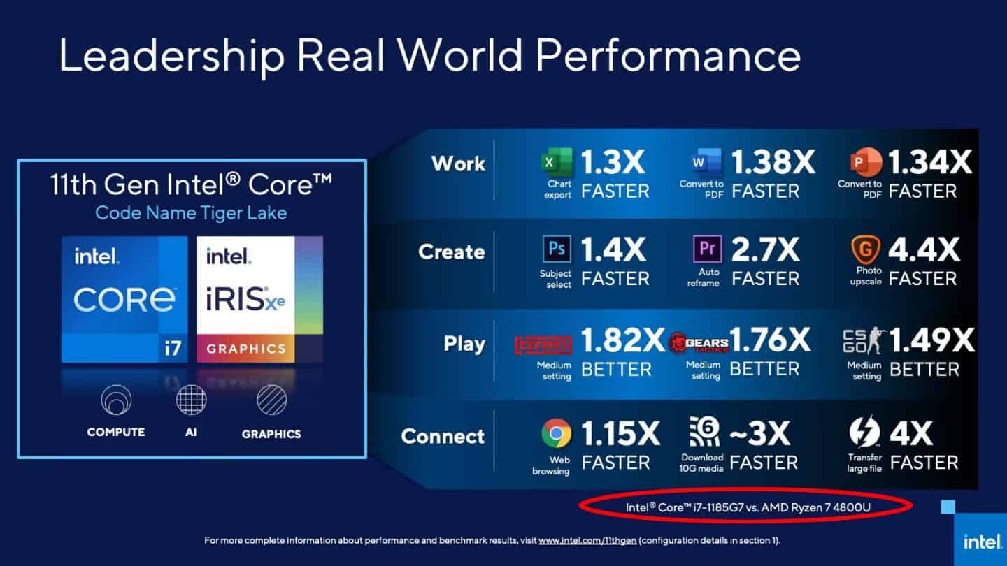 في الليلة التي سبقت موعد الإطلاق الرسمي للجيل الحادي عشر من المعالجات المحمولة “تايجر ليك”، أصدرت الشركة معلومات عن مواصفات الأداء، ولم تقتصر المقارنة على معالج رايزن-7-4800-يو (Ryzen 7 4800U) من صنف المنظومات العاملة على شريحة SoC من شركة إيه إم دي المنافسة، بل وصلت إلى شريحة إنفيديا جي فورس إم إكس 350 الرسومية (Nvidia Geforce MX350)، وهي وحدة معالجة رسومية موجودة في الأجهزة ذات المستوى الأخفض، التي تمثل أرخص الأجهزة التي يمكن ممارسة ألعاب الفيديو عليها.