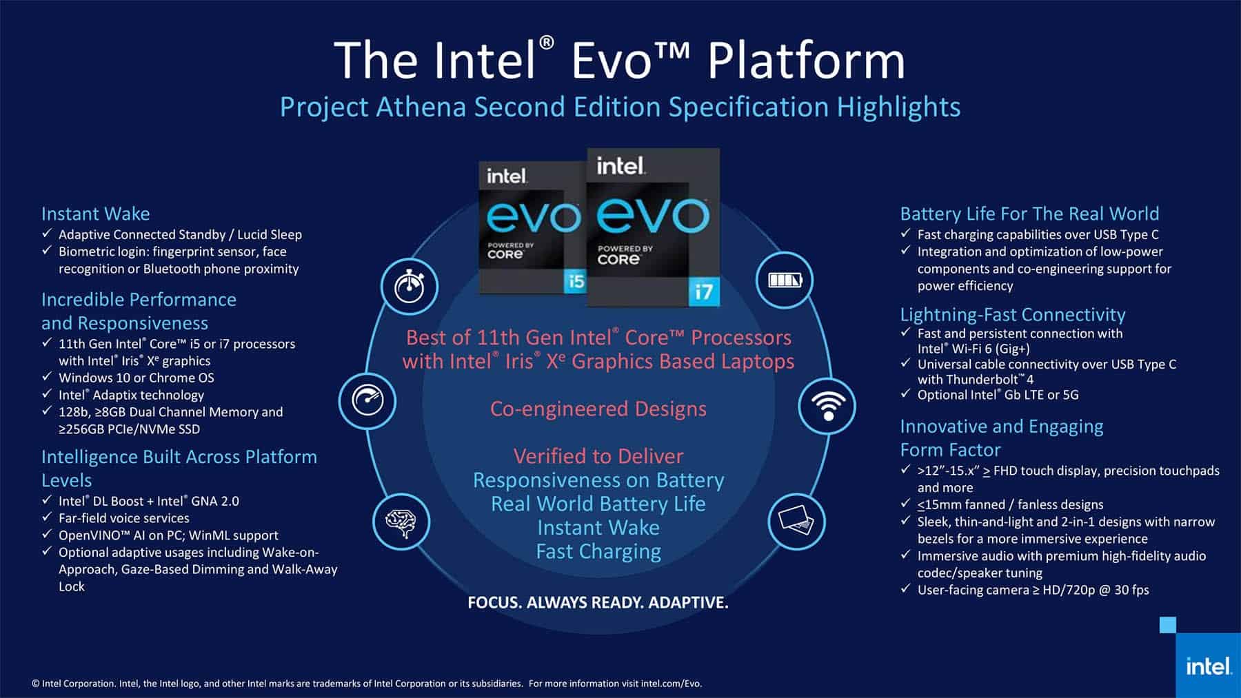 تعتمد منصة إيفو على المشروع الأساسي “أثينا”، حيث ترافق هذا الجيل الحادي عشر من شرائح كور، وهي في الواقع أكثر من مجرد ثنائية معالج/ وحدة معالجة رسومية، فهي مزودة معيارياً بواجهة اتصال واي فاي (من إنتاج إنتل)، وكذلك تكنولوجيا ثندربولت 4 للاتصال السلكي (التي طورتها وأنتجتها إنتل أيضاً). تتضمن أيضاً تكنولوجيا تسريع الذكاء الاصطناعي (التي ساهمت فيها نيرفانا)، وقد عمل مهندسو إنتل مع جميع شركات التطوير البرمجي الكبيرة حتى يضمنوا دعم تكنولوجيات هذه الشركات بشكل كامل.