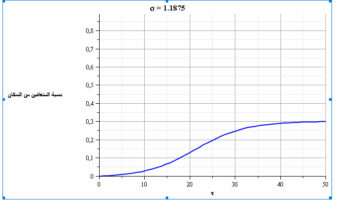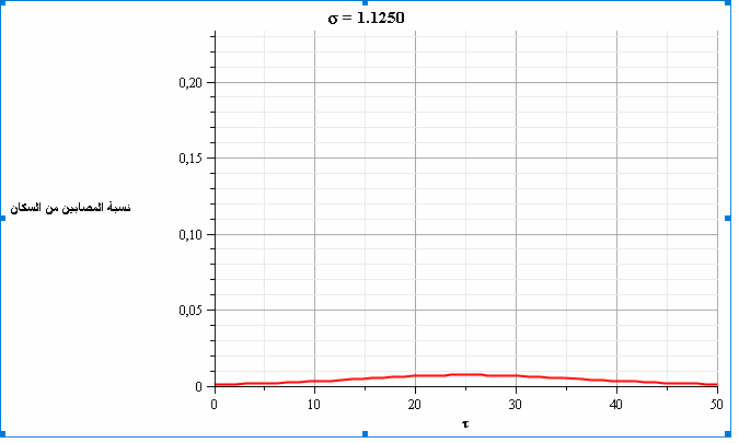 ومن خلال حل المعادلتين السابقتين، نحصل على الشكلين التاليين الذين يمثلان تطور نسبة المصابين والمتعافين بمرور الزمن ومع قيم متغيرة لعدد الاحتكاكات (σ). نلاحظ في الشكل 4 أنه عندما تكون قيمة عدد الاحتكاكات =2.5σ فإن ذروة نسبة الإصابات تتجاوز 20% من السكان.