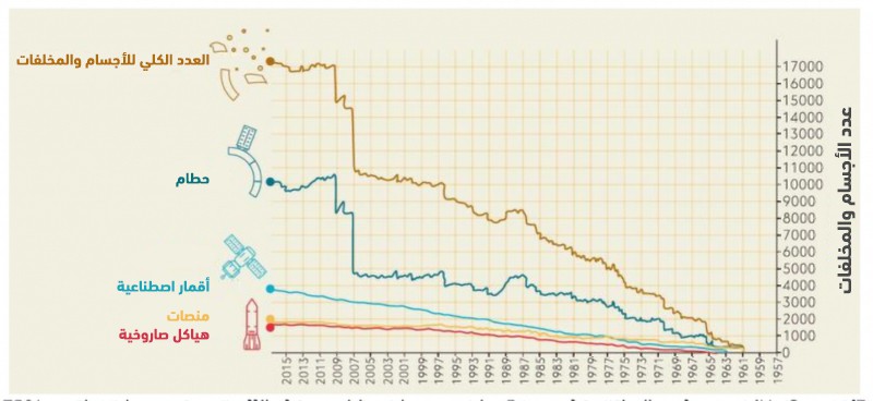 و6% فقط من هذه الأشياء هو أقمار اصطناعية نشطة، والباقي يتكون من أقمار اصطناعية ميتة وهياكل صاروخية وركام، وأغلبه ناجم عن انفجار أجزاء الصواريخ في مراحل احتراق الوقود المختلفة أثناء صعود تلك الصواريخ للفضاء. كما وقعت انفجارات لهذه المخلفات في الفضاء.