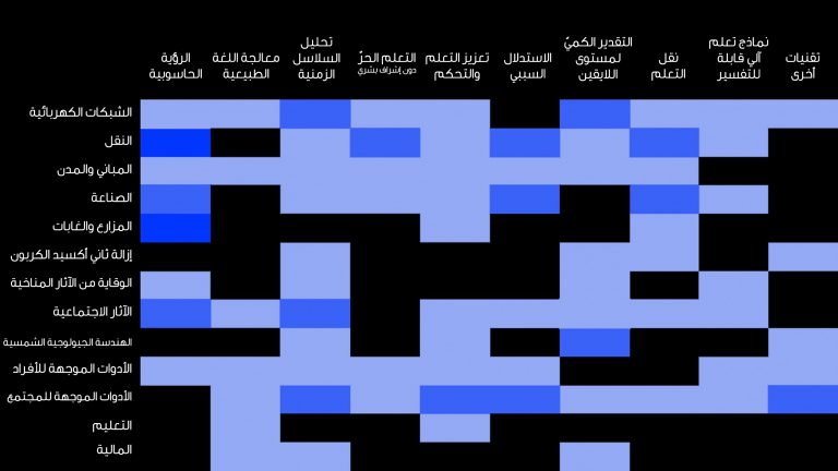 تتضمن الخارطة (التي صدرت في شكل دراسة) تدخلاتٍ من تقنية التعلم الآلي المُمكنة في 13 مجالاً، بدءاً من نُظُم شبكة الكهرباء مروراً بالمزارع والغابات ووصولاً إلى التنبؤ بالمناخ. كما قام مؤلفو الدراسة تحت بند كل مجال بتفصيل المساهمات التي تقدمها مختلف التخصصات الفرعية التي يشتمل عليها حقل "التعلم الآلي"، من بينها: الرؤية الحاسوبية، ومعالجة اللغة الطبيعية، والتعلم المعزز.