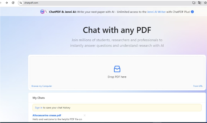 تشات بي دي إف (ChatPDF) هو أداة مدعومة بالذكاء الاصطناعي تضفي الحيوية على مستندات البي دي إف، فهي تسمح بالتفاعل مع ملفات بي دي إف بطريقة المحادثة، من خلال محول جي بي تي-3 (GPT-3) الخاص بأوبن أيه إي، ما يسهل استخراج المعلومات بلغات متعددة، والحصول على الملخصات وفهم المحتوى. لاستخدامها في الحصول على ملخص يمكنك اتباع ما يلي: