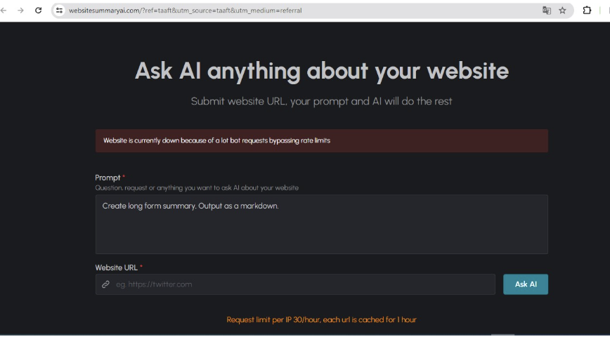 تسمح الأداة بإنشاء 30 ملخصاً في الساعة لكل عنوان أي بي (IP)، ويُخزن كل عنوان URL مؤقتاً مدة ساعة واحدة.