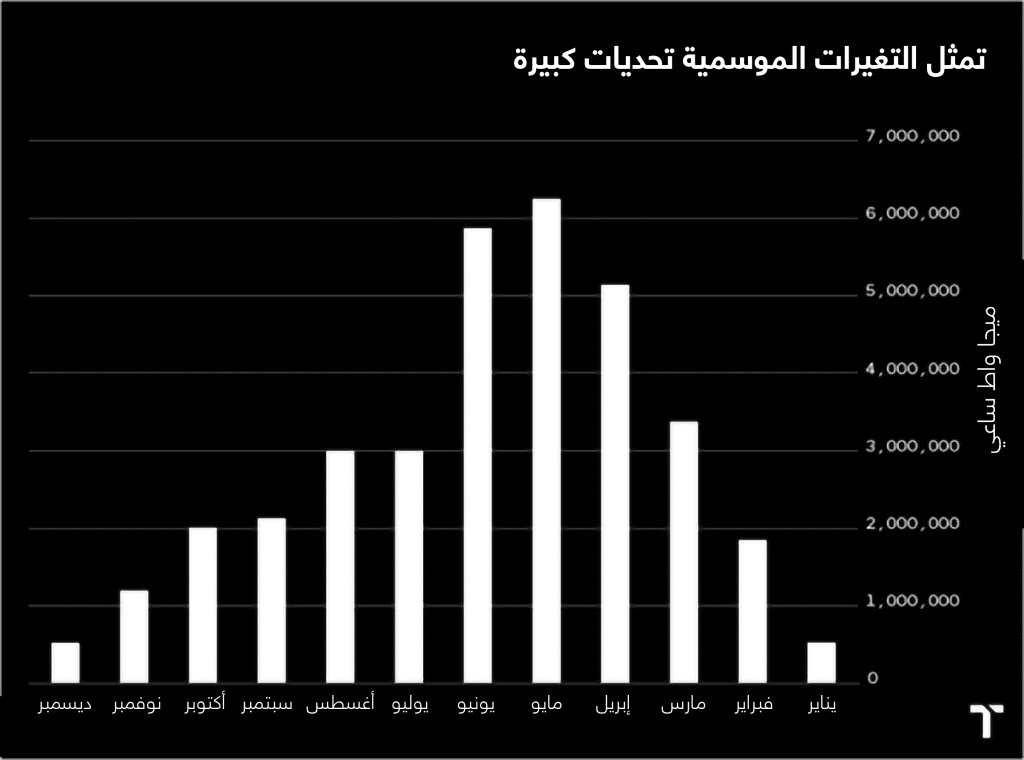 ولا تعتبر تقنية أيونات الليثيوم مكلفة بالنسبة لهذا الدور فقط، بل إن محدودية حياة البطارية تعني أنها غير ملائمة لتعويض النقص الحادث في الأيام أو الأسابيع -أو حتى الأشهر- التي يتوقف فيها توليد طاقة الرياح والشمس، وتظهر هذه المشكلة بوضوح في كاليفورنيا؛ حيث ينخفض إنتاج طاقتي الرياح والشمس بشكل حاد في أشهر الخريف والشتاء، كما يبدو في الأنماط الموسمية الموضحة في الشكل التالي: