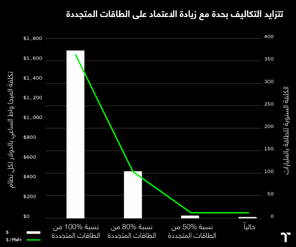 إن الوصول إلى المستويات المطلوبة من التخزين والتوليد بالطاقات المتجددة لتحقيق أهداف الولاية سيزيد من التكاليف بشكل مضاعف؛ من 49 دولار لكل ميجا واط ساعي عند نسبة 50% إلى 1,612 دولار عند نسبة 100%، وذلك مع افتراض أن تكاليف بطاريات أيونات الليثيوم ستبلغ تقريباً ثلث قيمتها الحالية.